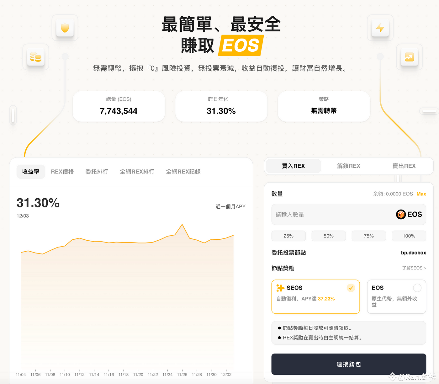 DAOBOX是EOS主网质押矿池生态,其特点是:“0”风险,无需转币,币还在你的钱包里,自动复投,高年化,无损年化收益30%+。吃着年化30%+的利息,哪怕EOS不涨了,也有30%的收益。笔者在0.4美元的时候建仓EOS,锁仓EOS吃了2个月的高年化,最近1.5美元的时候,解锁卖了一部分EOS回本,剩下利润在里面自然增长。然后你根据自身目标价位,解锁部分售卖,你认为到了3美元,就解锁20%卖,到了5美元,再解锁20%卖。这样平衡保守策略,才能在牛熊中立于不败之地。
