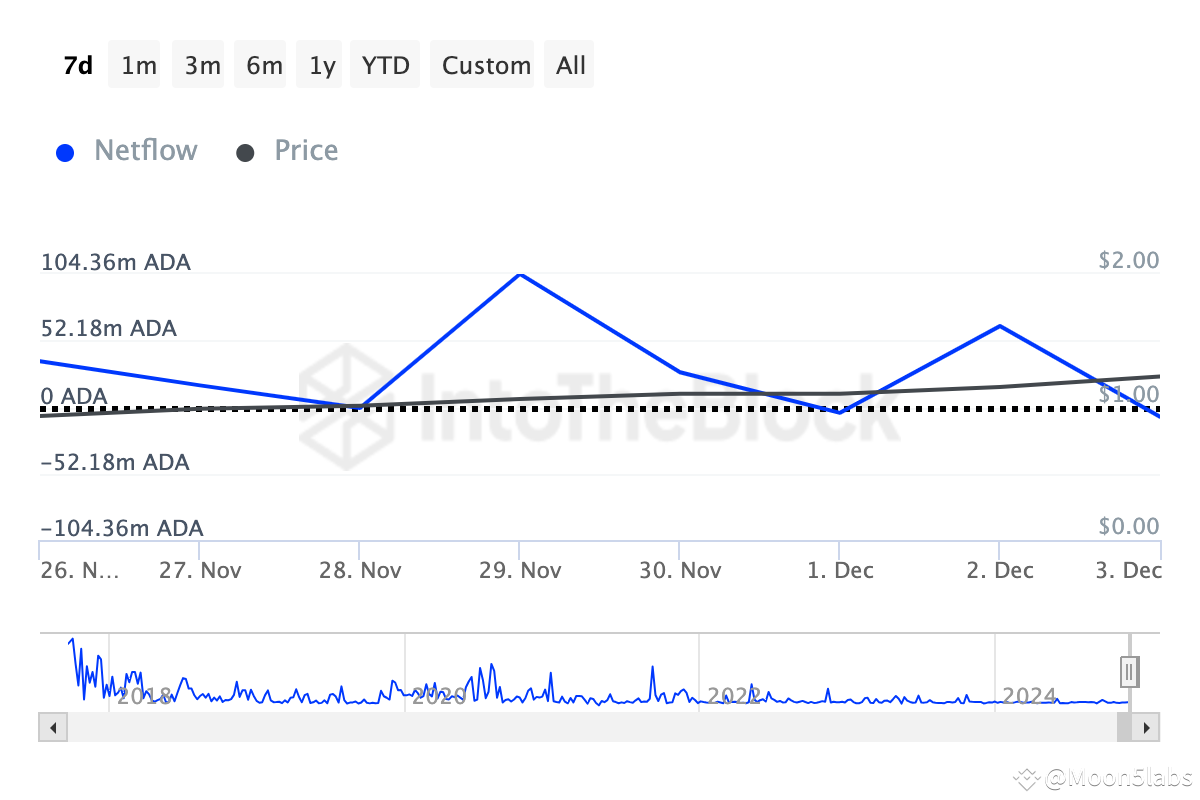 Since then, the net flow has dropped to 7.62 million ADA, indicating that whales sold 55.96 million ADA, likely to realize profits or rebalance their portfolios. At the current price of ADA, this sell-off amounts to approximately $69 million.