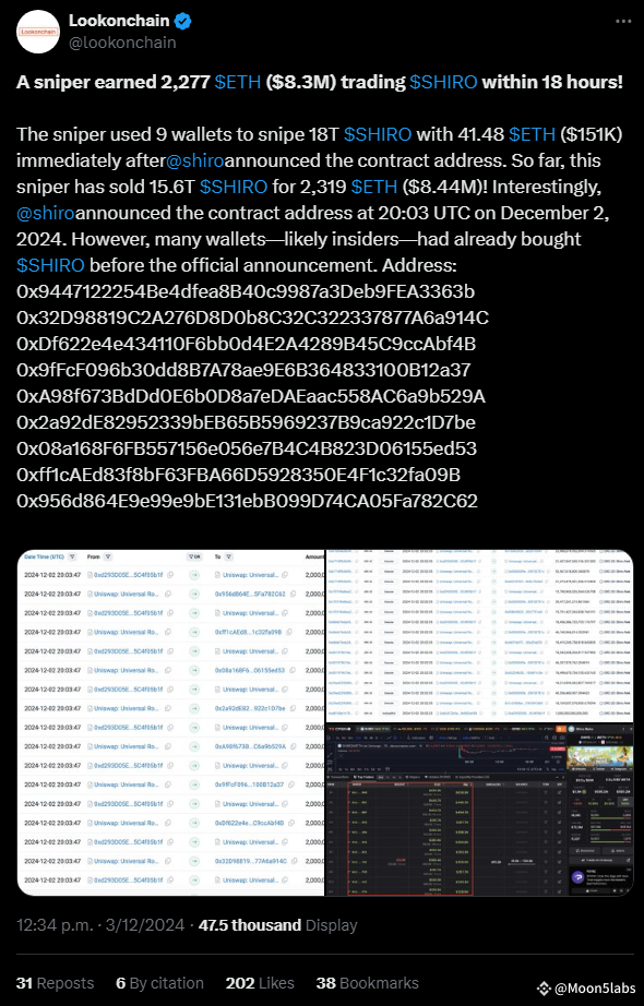 Following this massive purchase, the sniper sold 15.6 trillion $SHIRO for 2,319 ETH, amounting to $8.44 million. The contract address was officially announced on December 2, 2024, at 20:03 UTC, but records show that several wallets had already purchased $SHIRO before the public announcement. This raises concerns about potential use of insider information.