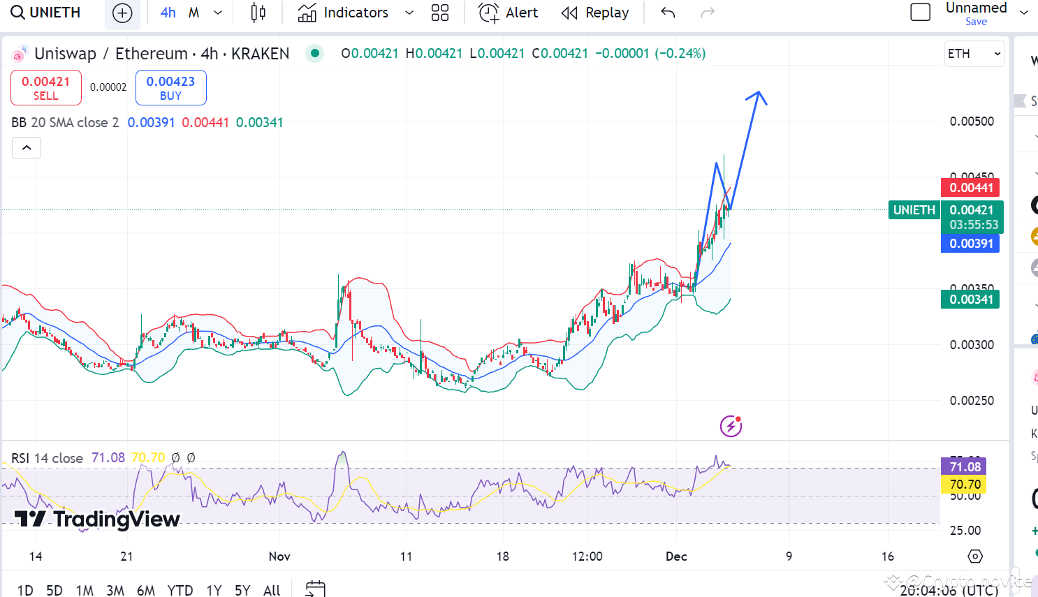 Here we can see that on uni pair eth chart, it is bullish. It is holding Bollinger Bands support level. It also got sellers pressure for retest. Now it will go boom. We can go long for this coin.