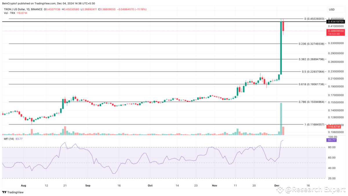 On the daily chart, Tron’s TRX faced resistance at $0.43, leading to a pullback to $0.39. However, the Money Flow Index (MFI) suggests that this retracement may be temporary.