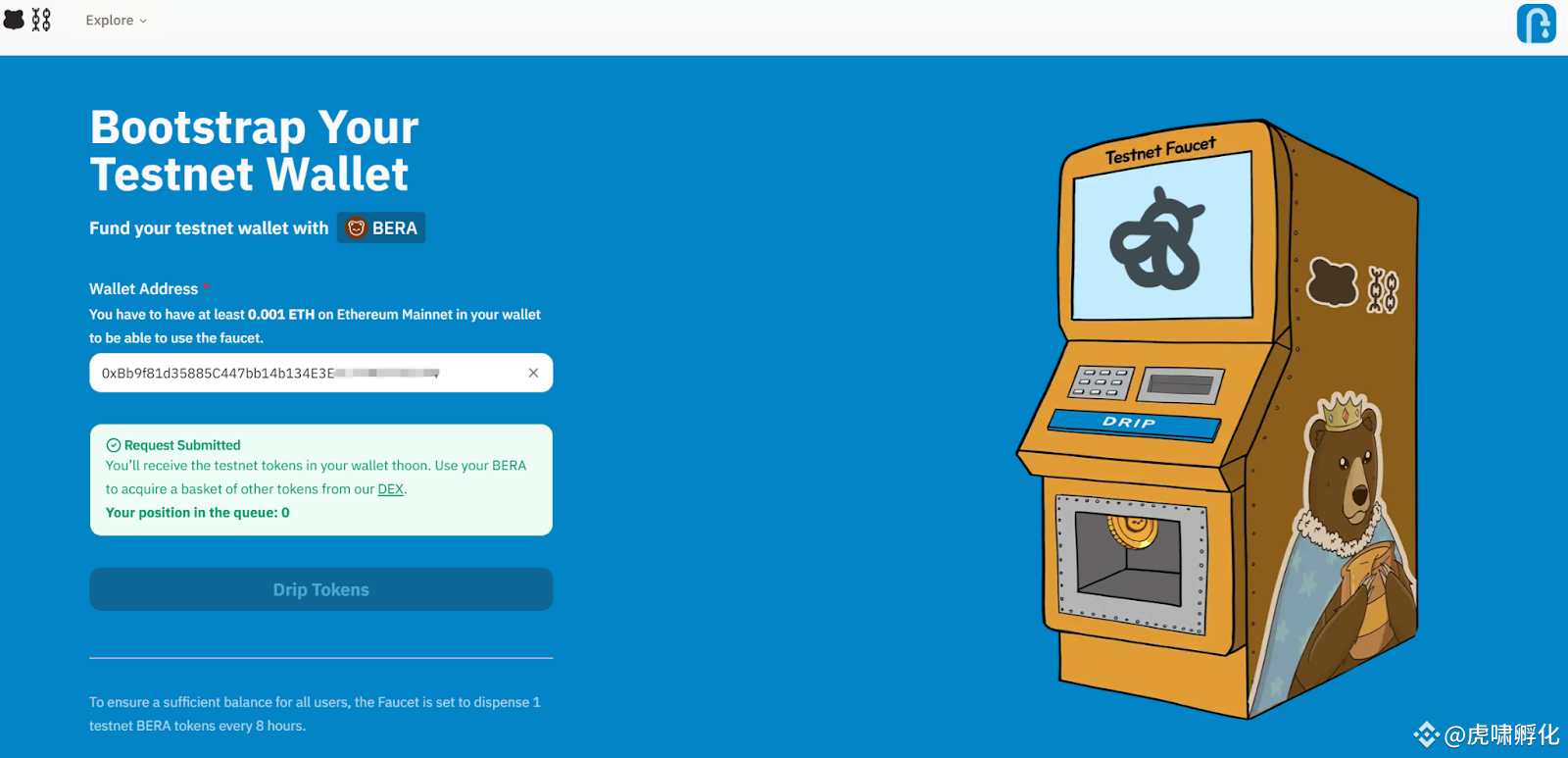 去往 Berachain 网站 https://bartio.faucet.berachain.com/ 在水龙头认领 Bera (你的钱包在以太坊主网至少有0.001ETH)