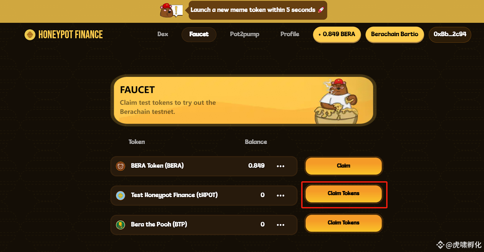 找到并移步导航栏上的水龙头。在 Honeypot 网站上申 tHPOT 测试币。