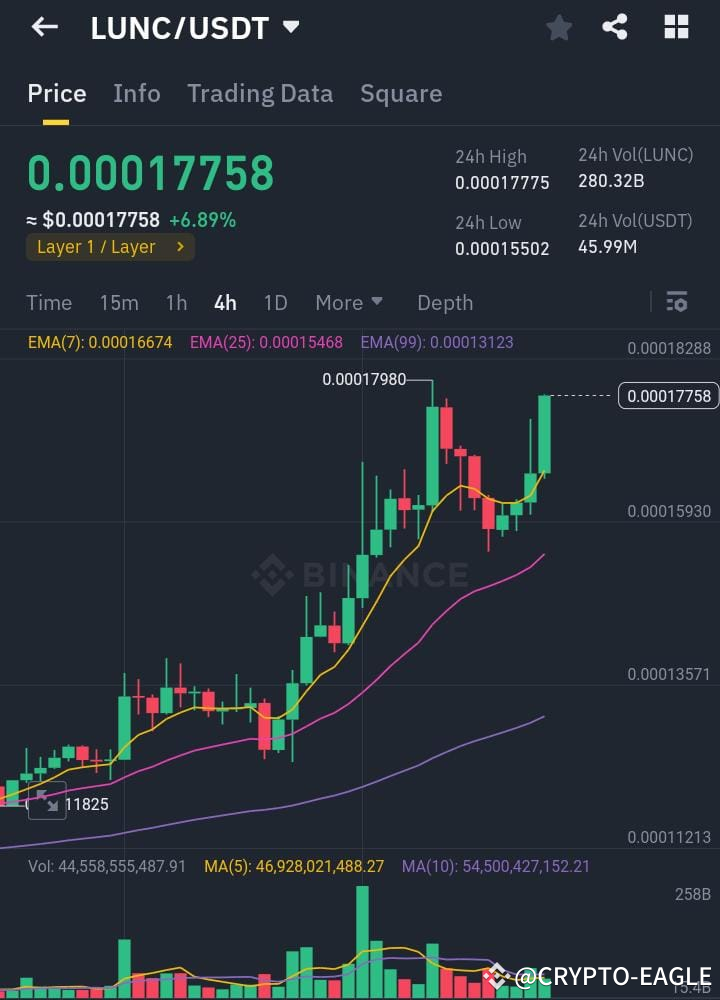 The $LUNC /USDT trading pair is experiencing a strong bullish trend, with a 6.89% increase in the last 24 hours. The current price is $0.00017758. Technical indicators show a bullish signal, with the 7-day EMA at $0.00016674 and the 25-day EMA at $0.00015468.