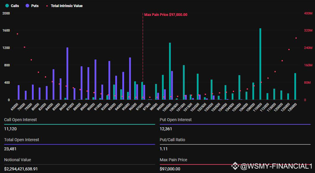 وفقًا لبيانات ديربيت، من المتوقع أن تنتهي صلاحية 23,481 عقد بيتكوين، بقيمة اسمية تقارب 2,29 مليار دولار، اليوم. نسبة البيع إلى الشراء لبيتكوين هي 1,11. نقطة الألم القصوى — السعر الذي سيتسبب في خسائر مالية لأكبر عدد من الحائزين — هي 97,000 دولار. هنا، ستنتهي معظم العقود بلا قيمة.
