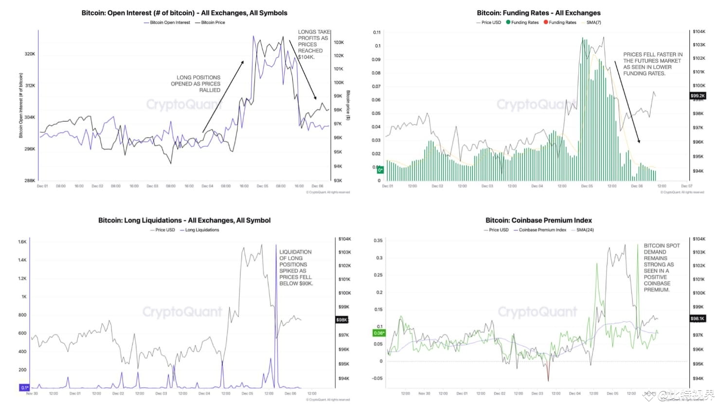 比特币 #BTC☀️ 暴跌的原因,主要是期货去杠杆化导致的,但现货需求依然强劲,而未平仓合约随着价格下跌而下降,标志着期货多头的平仓,资金费率也在下降这说明期货价格下跌速度快于现货价格(图4)