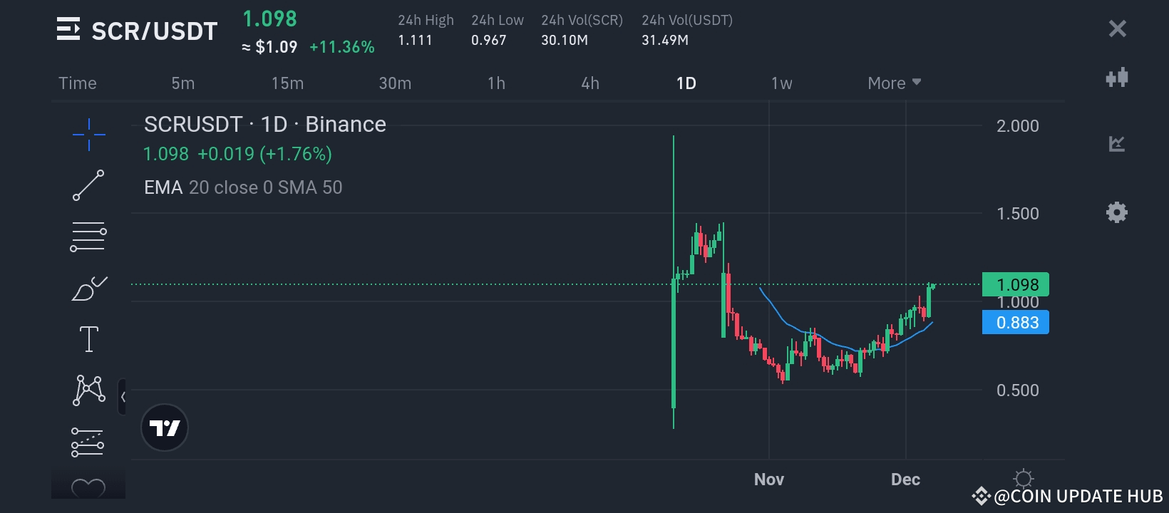 The SCR/USDT pair has been gaining momentum, with the current price sitting at $1.098, reflecting an 11.36% increase in the last 24 hours. Here’s a deeper dive into the key metrics and technical analysis: