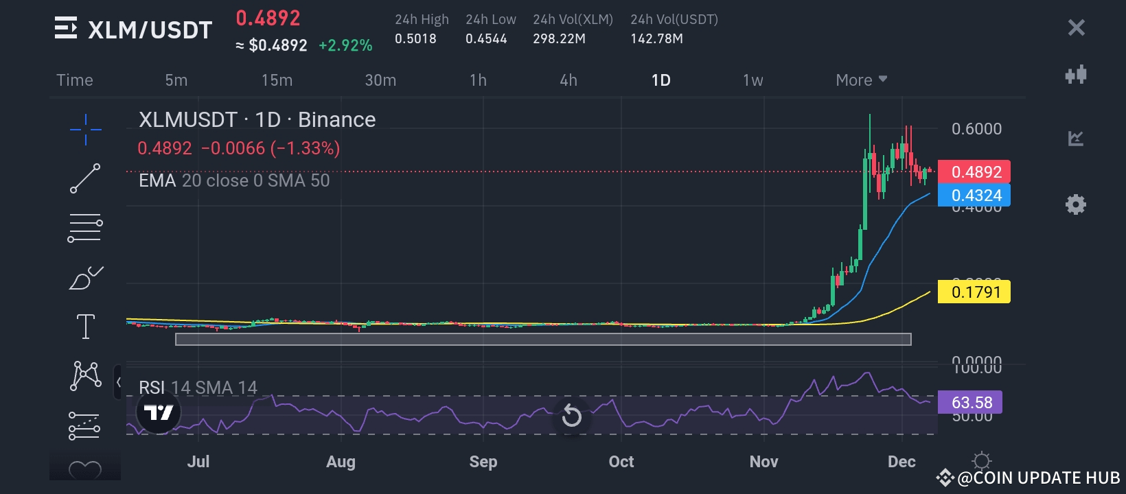 As of now, XLM/USDT is trading at $0.4892, showing a slight pullback of -1.33% over the past 24 hours. Despite this minor dip, the asset has shown remarkable strength in recent weeks, climbing to impressive highs and attracting considerable market attention. Let’s take a deep dive into the current situation and what it means for traders and investors.