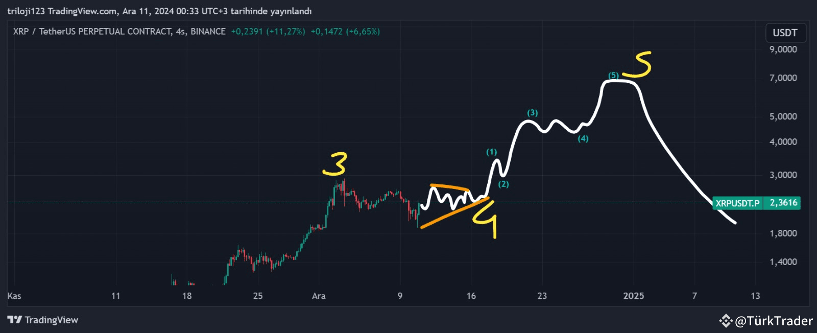 According to Elliott Wave Theory, XRP has the potential to reach 6-7 USDT by the end of the year. The chart indicates a strong third wave (Wave 3), which represents a powerful upward movement. Following a minor correction (Wave 4), the fifth wave (Wave 5) is expected to drive XRP to new highs. This upward momentum is anticipated to unfold as we approach the year-end.