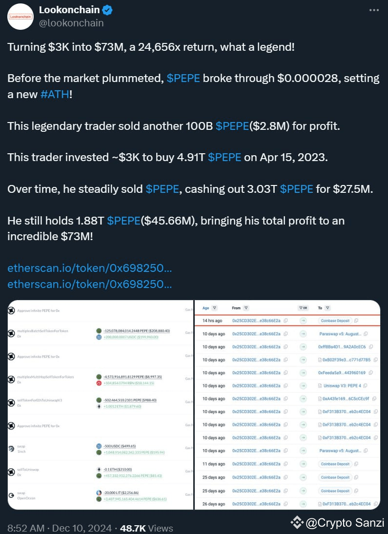 💵 Bought 4.91T $PEPE for pocket change in April 2023, sold 3.03T for $27.5M, dumped another 100B for $2.8M, and still chilling with 1.88T $PEPE worth $45.66M.