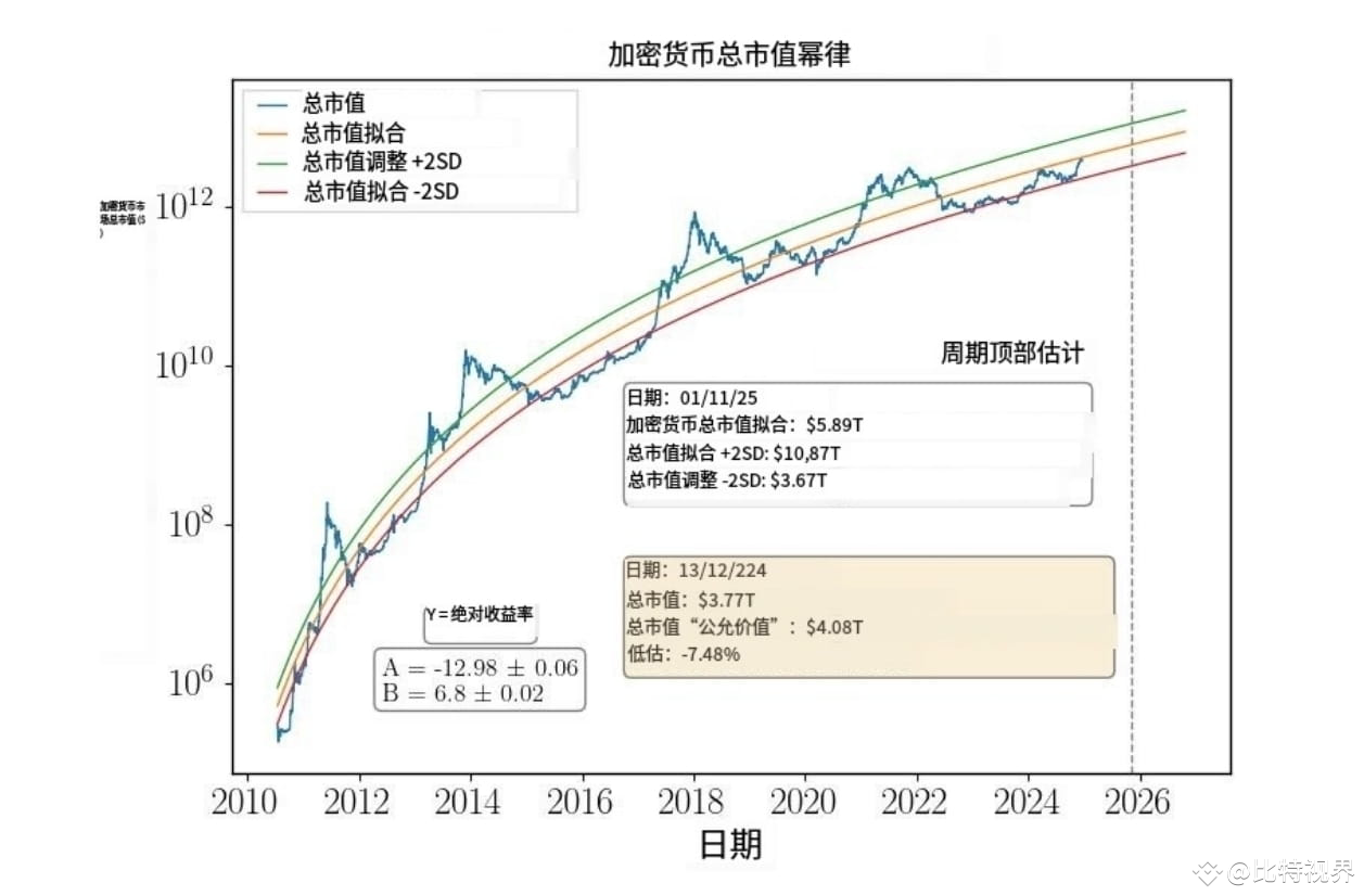 5.目前加密货币 #Crypto🚀🚀 总市值为3.77T 美元,接近其4.08T美元的公允价值,在2025年牛市周期顶部的估计至少为+2SD,估值达到10.8T美元(假设峰值出现在2025年11月左右),仍有巨大的增长空间