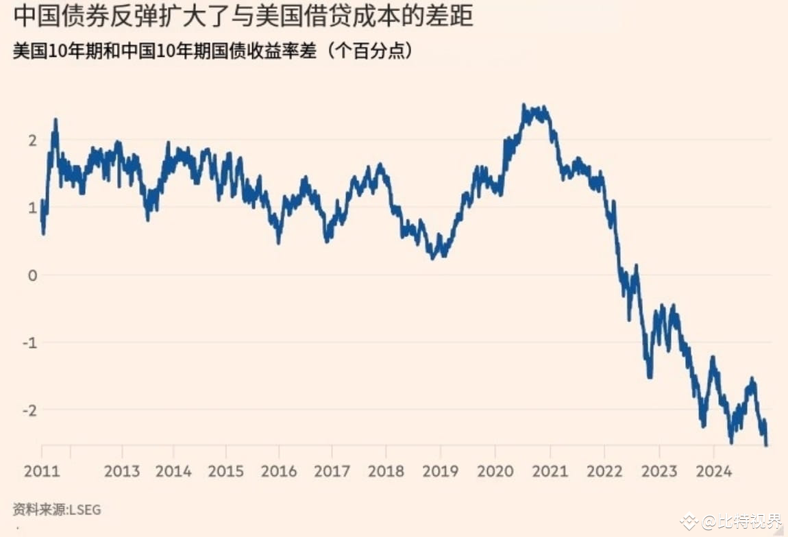 2.中美 #十年期国债 借贷成本差距已达13年多以来最大的水平(图1)