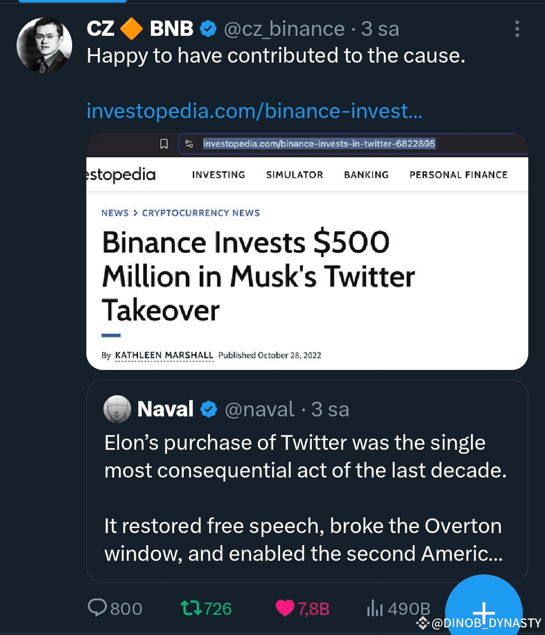 #Binance , la plus grande plateforme de cryptomonnaies au monde par volume d’échanges, a investi 500 millions de dollars dans l’accord de 44 milliards de dollars pour l’acquisition de Twitter par Elon Musk. Ce mouvement stratégique suscite des spéculations sur une possible intégration de la technologie blockchain dans la célèbre plateforme de médias sociaux.