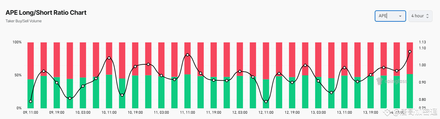 根据数据分析,ApeCoin当前的多空比为1.10,多头仓位显著高于空头仓位,表明市场对短期前景的乐观情绪正在加剧。强劲的多头情绪可能成为推动价格突破的重要动力。