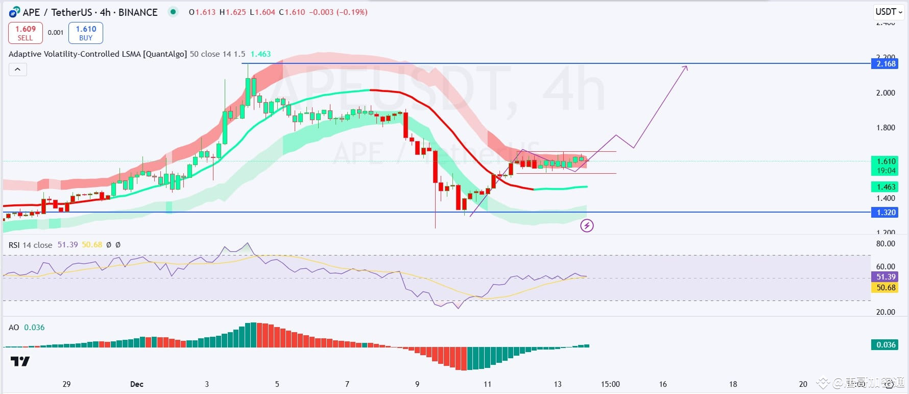 从4小时K线图来看,ApeCoin形成了经典的“牛旗形态”。旗杆上扬后,价格短暂盘整,等待爆发性突破的契机。