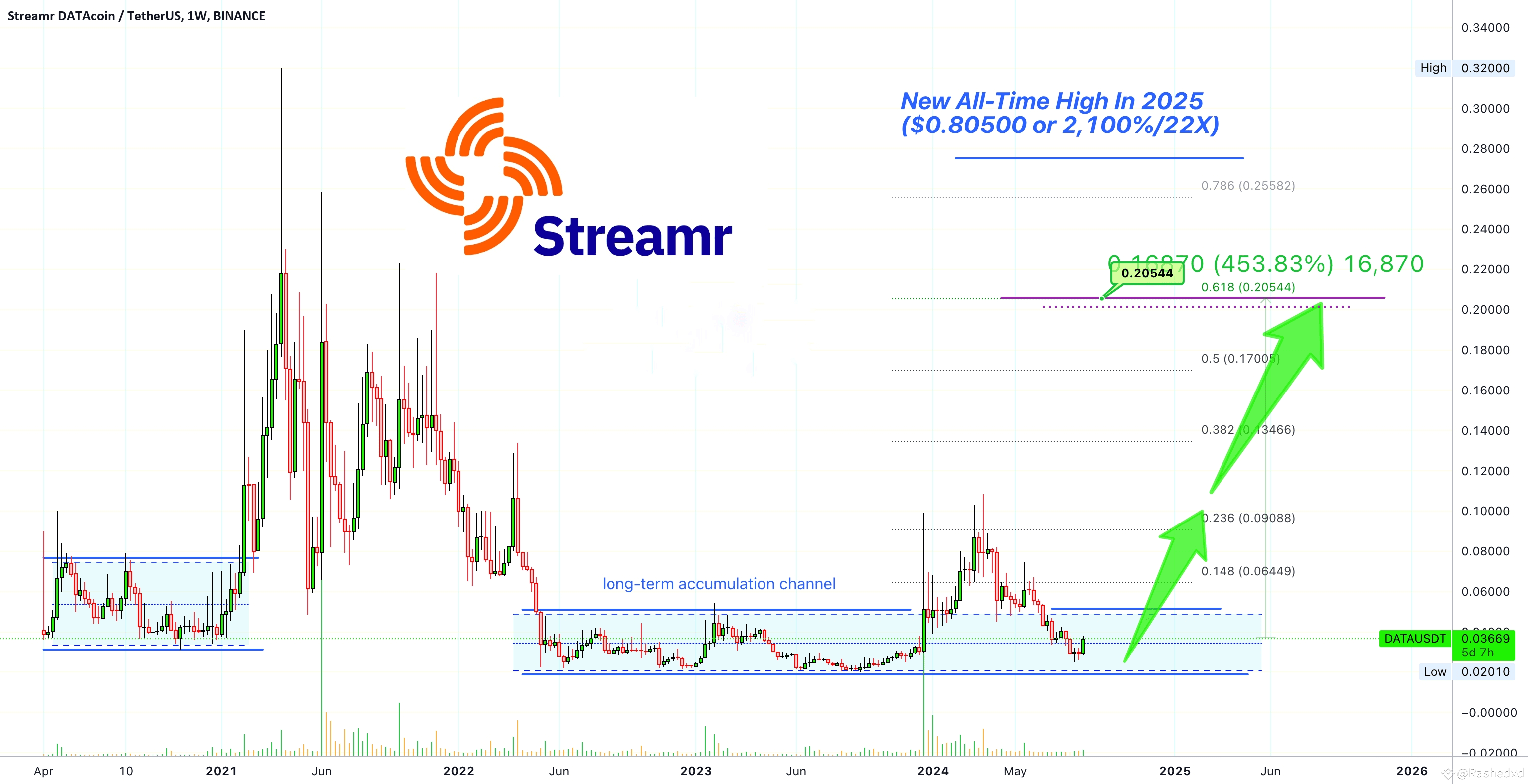 Streamr in its Tether pairing, DATAUSDT, can grow massively in 2025. ATH potential goes to 2,150% or around 22X; from current price to around $0.80500. This is easily do-able within the crypto-space. This would be easy now and even more so when euphoria takes hold of the market next —money printing— year.