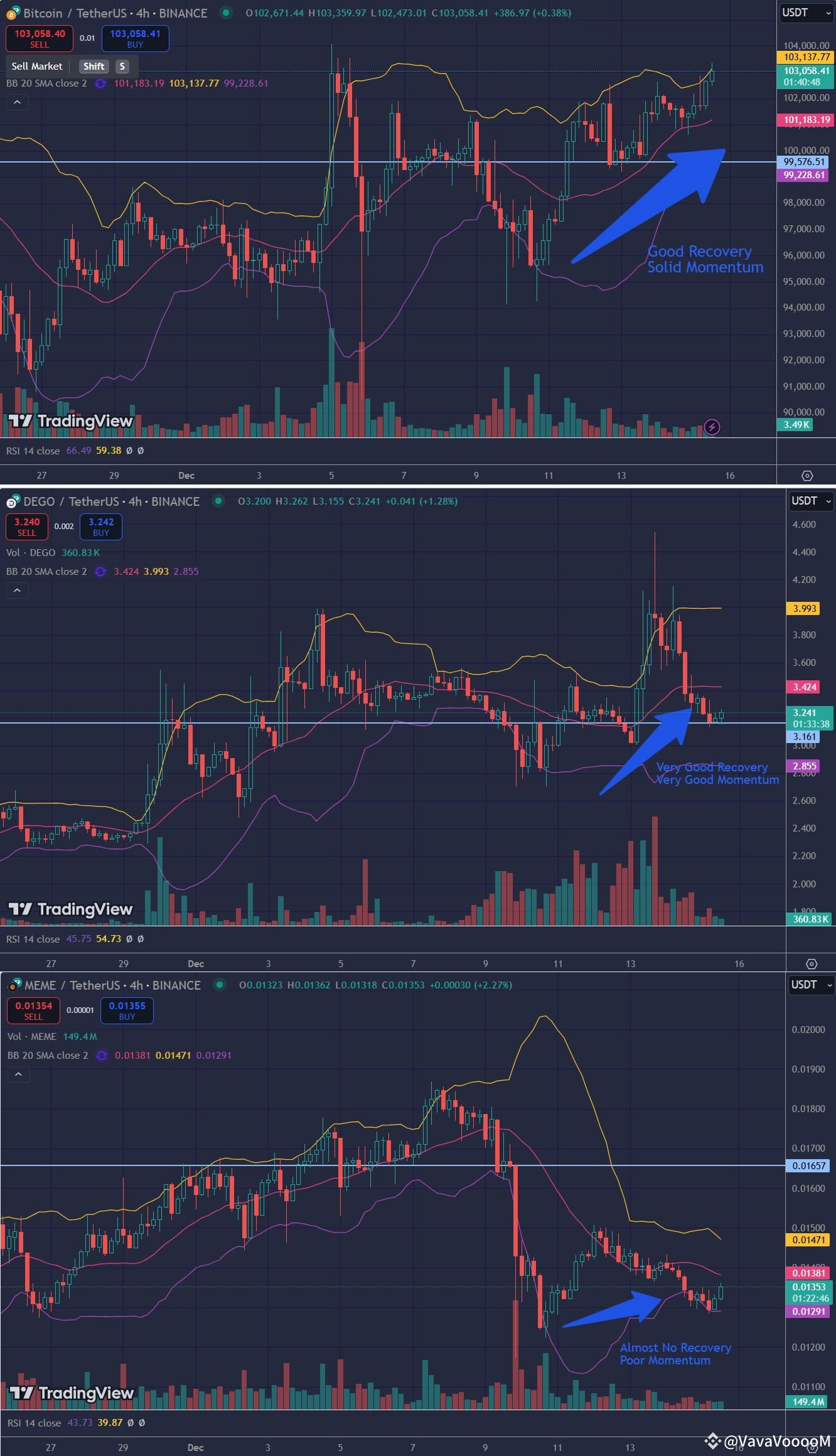 Here below I am showing you different levels of momentum / strength of momentum for 3 coins: $BTC , $DEGO , $MEME
