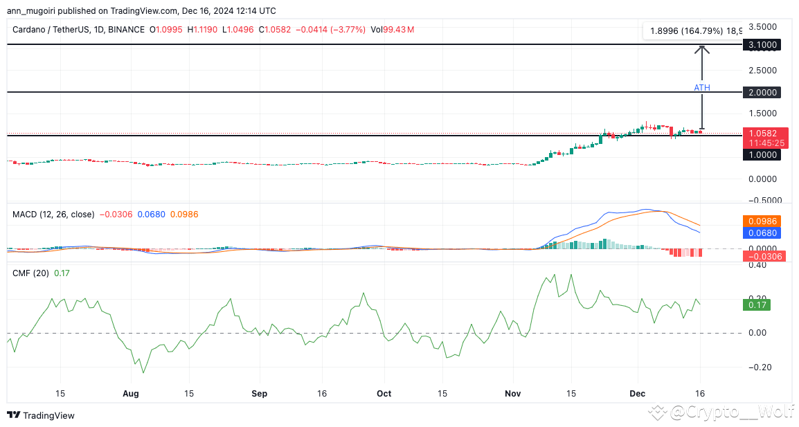 The MACD indicator shows a potential reversal. The MACD line has crossed below the signal line, indicating short-term bearish sentiment. The Chaikin Money Flow (CMF) is currently positive at 0.17, signaling strong inflows of capital into ADA.