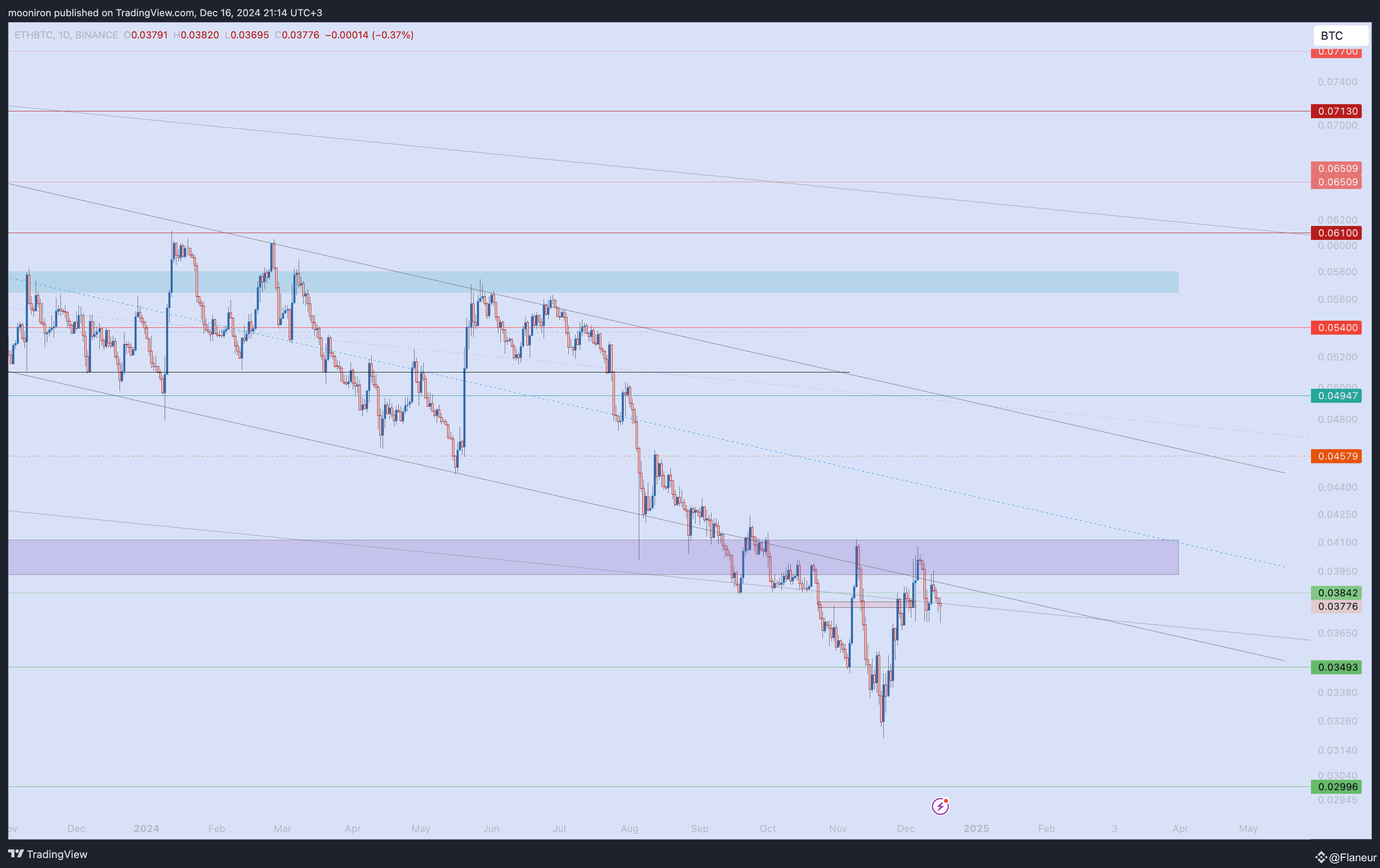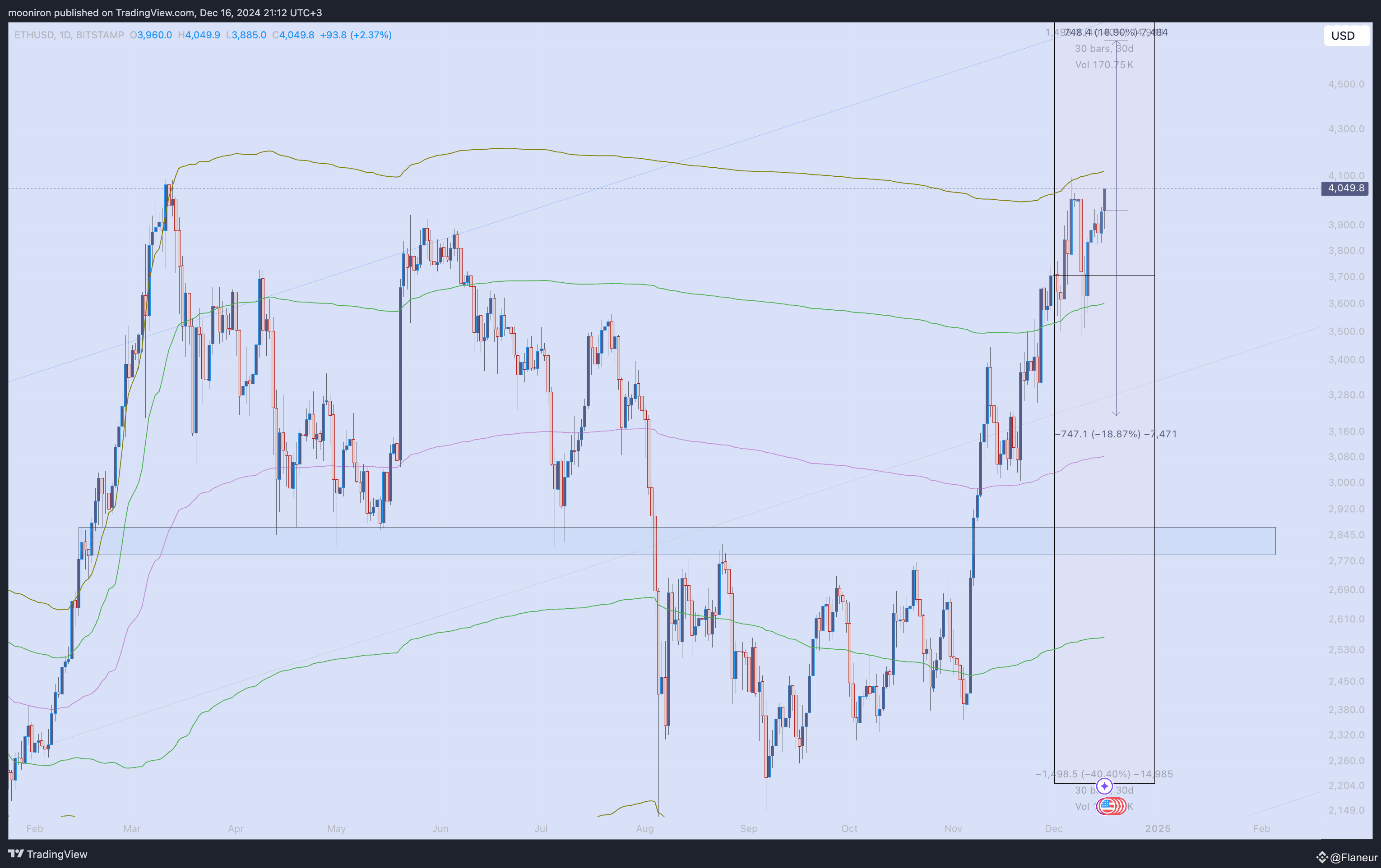 ETH, which opened November at 2500 and December at 3700, is testing the 4000 resistance. After a sharp sell-off at the beginning of the week, it's slowly climbing up but still hasn't met expectations due to its weakness against BTC. I think the price will move more sharply with sustainability above 4100, but I believe it should proceed with confirmation. One shouldn't move too confidently before 4-hour and daily closings.