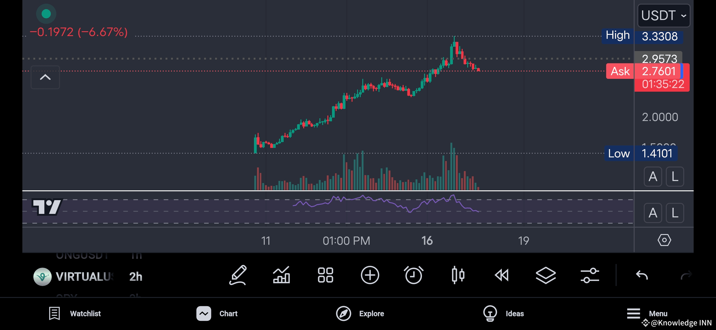 The price has seen a strong upward trend, peaking at 3.3308, but has started to decline, forming a series of red candles.