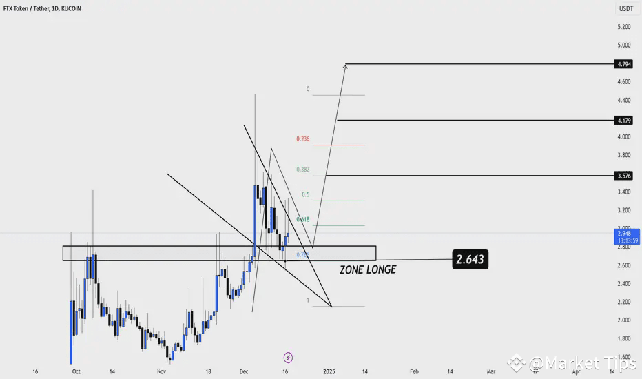 FFTT/USDT is consolidating above the Zone Long at $2.643, a key support area that aligns with the 0.786 Fibonacci level, signaling a potential rebound. The first target (T1) is $3.576, followed by $4.179, and the extended target at $4.794. A break above the downtrend resistance and strong buying volume would confirm the bullish momentum. Stop-loss can be placed below $2.643 to manage risk effectively