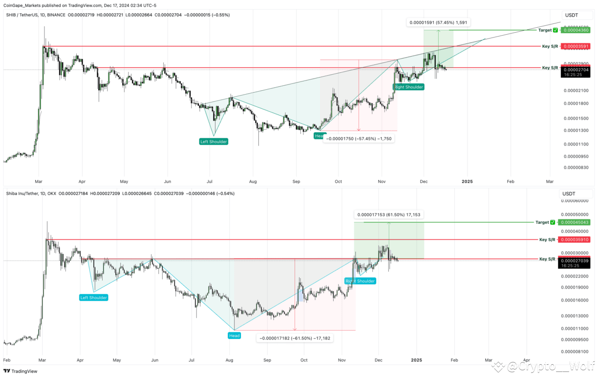 The inverse target is obtained by measuring the distance between the head’s right most part and its lowest point and adding it to the breakout point.. The target is calculated by measuring the distance from the head’s low to the neckline and adding it to the breakout point. This pattern forecasts a potential move toward 0.000023 for Shiba Inu, indicating strong upward momentum.