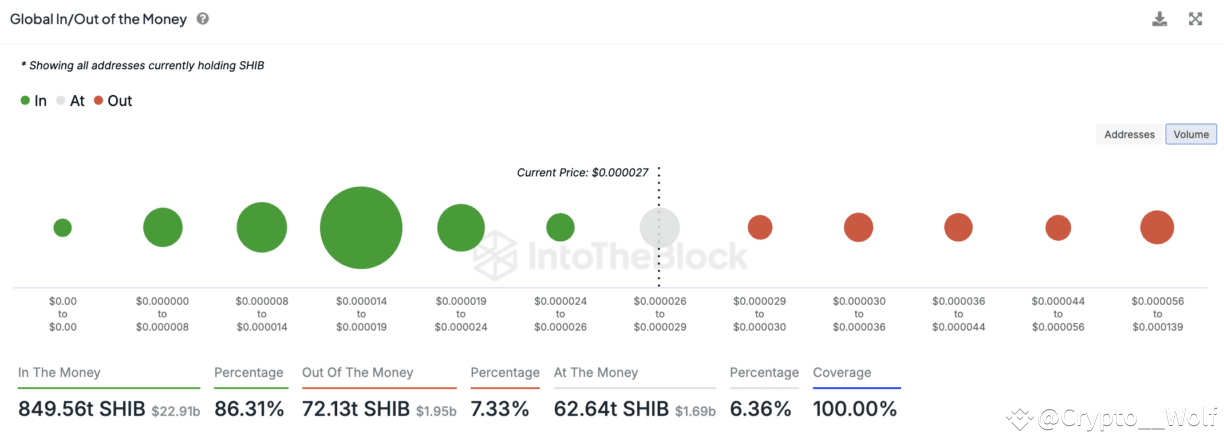 The majority of Shiba Inu price holders are profitable, signaling potential bullish momentum. According to the GIOM metric, 86.31% (849.56 T SHIB) are in profit, 6% (62.64 trillion SHIB) are at break-even, and 7% (72.13 T SHIB) are at a loss.