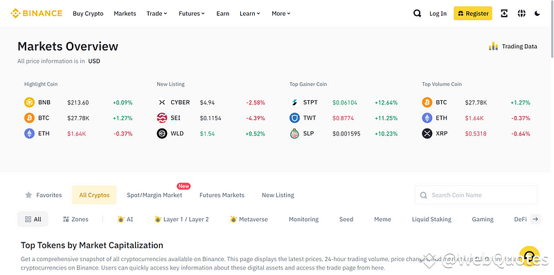 If you are looking for a comprehensive snapshot of all cryptocurrencies available on Binance, the Markets tab on the Binance website is where you find it. This page displays the Top movers and the latest prices, 24-hour trading volume, price changes, and market capitalizations for all cryptocurrencies on Binance.