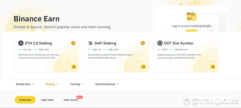 Choose from flexible and locked plans in Binance ETH 2.0 Staking, Defi Staking — Dedicated to increasing user staking income, and DOT Slot Auction on DOT parachain. Choose between flexible or locked earnings.
