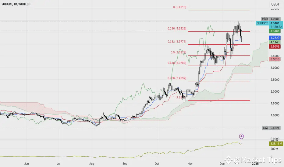Sui’s price action has been strongly bullish on the daily timeframe, forming higher highs and higher lows since late October. The uptrend began in September when local resistance at $0.9-$1 was broken and retested as support.
