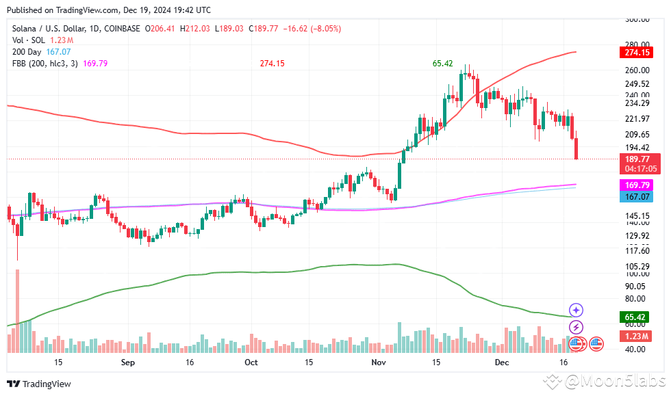As of December 20, Solana is trading around $191.17, reflecting a 11.88% decrease compared to the previous close. The intraday high reached $215.58, while the low settled at $191.06. This decline mirrors the overall volatility in the cryptocurrency market, driven by macroeconomic factors and regulatory developments.