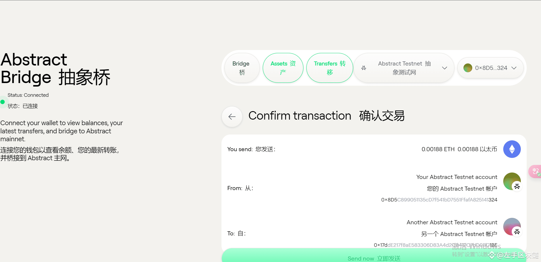 切换至“桥接”标签页 将 ETH 从 Sepolia 网络桥接到 Abstract 测试网 输入您希望桥接的代币数量 批准交易