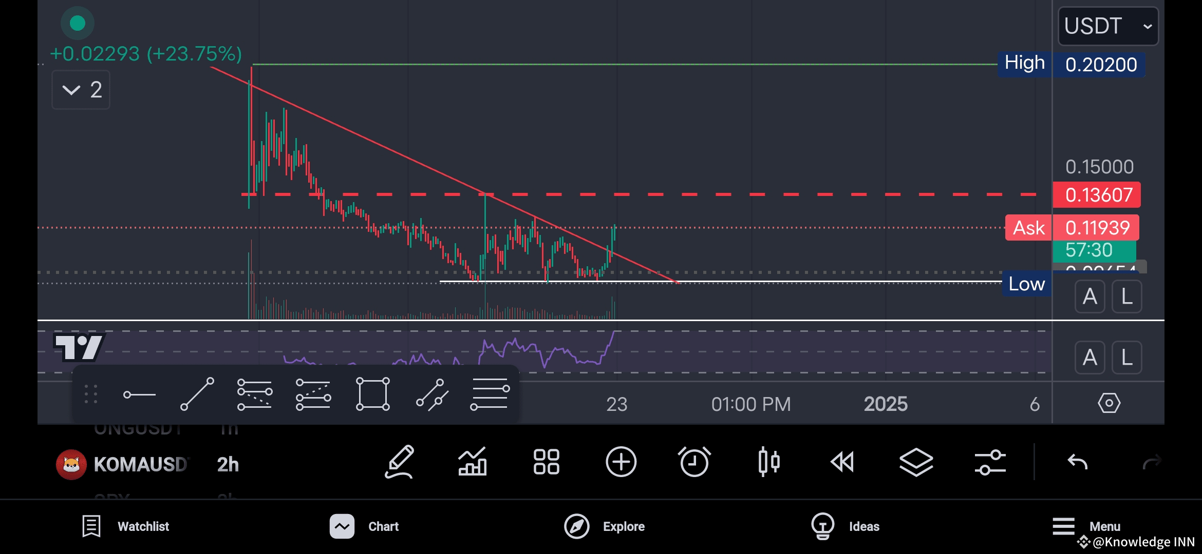 1. Market Sentiment: The price has broken above the descending trendline, indicating a potential shift from a bearish to bullish sentiment. The breakout is accompanied by a noticeable price surge (+23.75%), suggesting buying pressure.