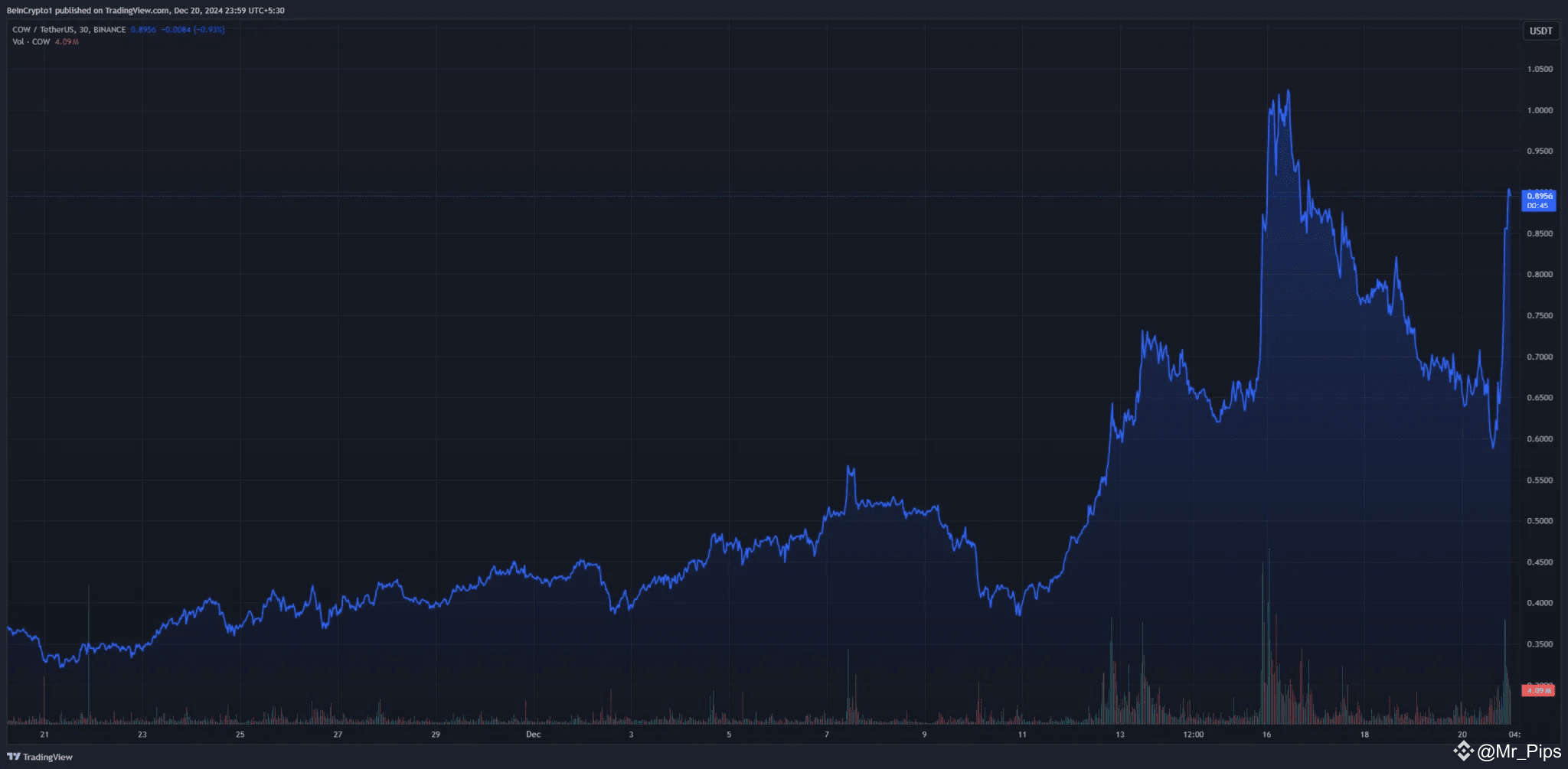 WLFI’s investment models have fueled market rallies throughout December. Earlier this month, the project spent over $45 million, including purchases of Ethereum, Ondo (ONDO), and Ethena (ENA), pushing COW to $1.02, its highest value in over a year.