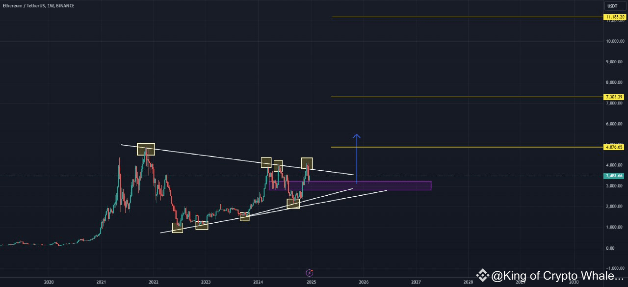 On the weekly timeframe, Ethereum is forming a long-term symmetrical triangle.