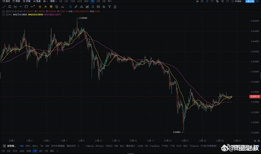 当前价格:DOGE目前在0.33附近震荡,近期从低点0.26逐步反弹,但上方仍受制于关键均线压制。