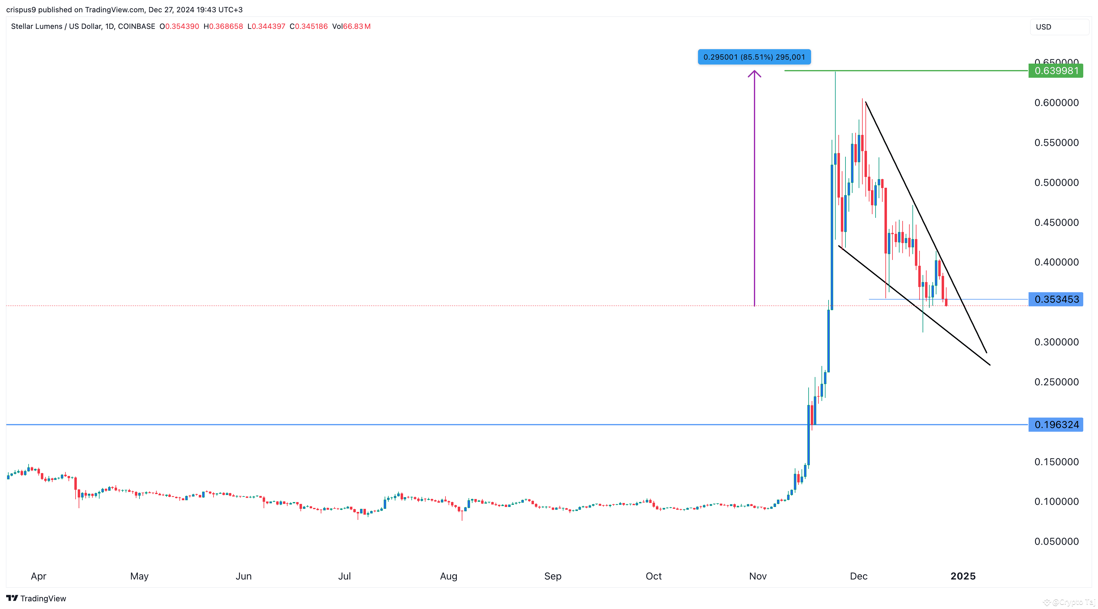 The daily chart shows that the XLM price is forming a falling wedge pattern, a popular bullish sign. The two lines of this pattern are nearing their confluence, pointing to more gains ahead. A strong rebound will see Stellar price rising to $0.6400, its 2024 high, which is about 85% above the current level.