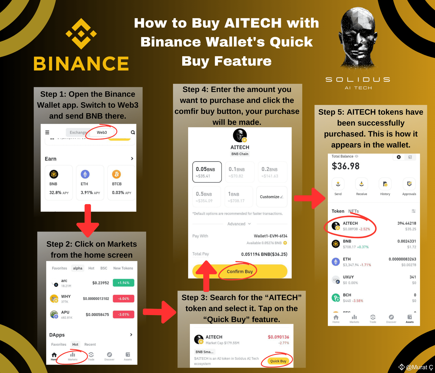 Buying AITECH using Binance Wallet's Quick Buy feature is quite simple. Open the Binance #Wallet app, select the Quick Buy feature, find the AITECH #token and complete the purchase. The infographic explains the purchase process in a simple way.