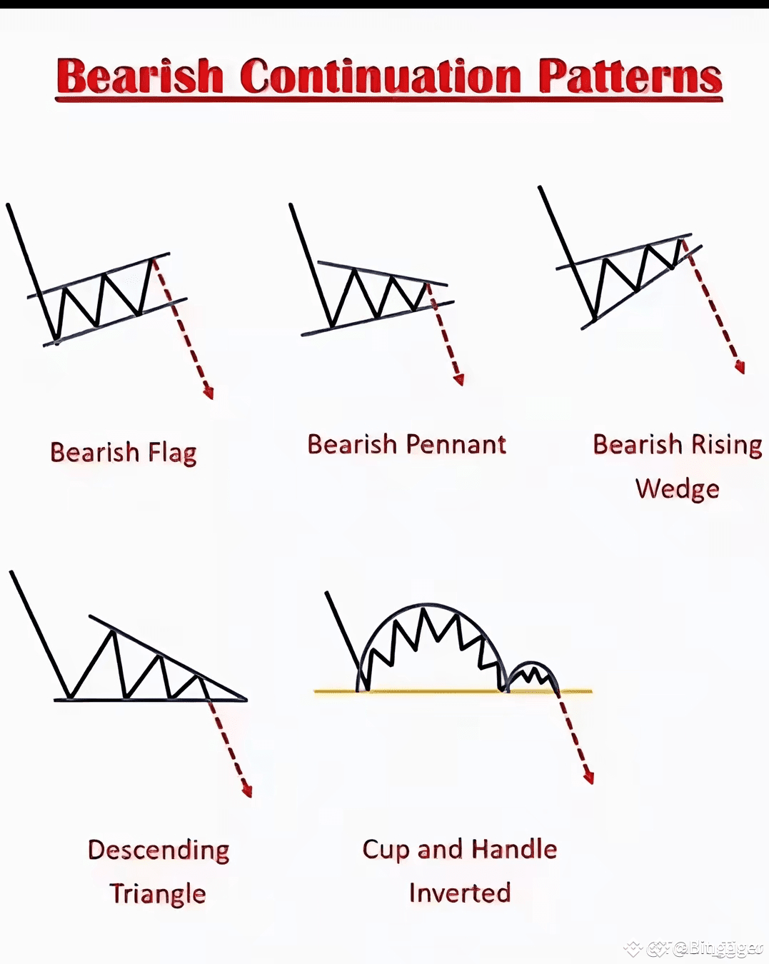 These patterns indicate that a downtrend is likely to continue after a consolidation phase. Here are the key bearish patterns:
