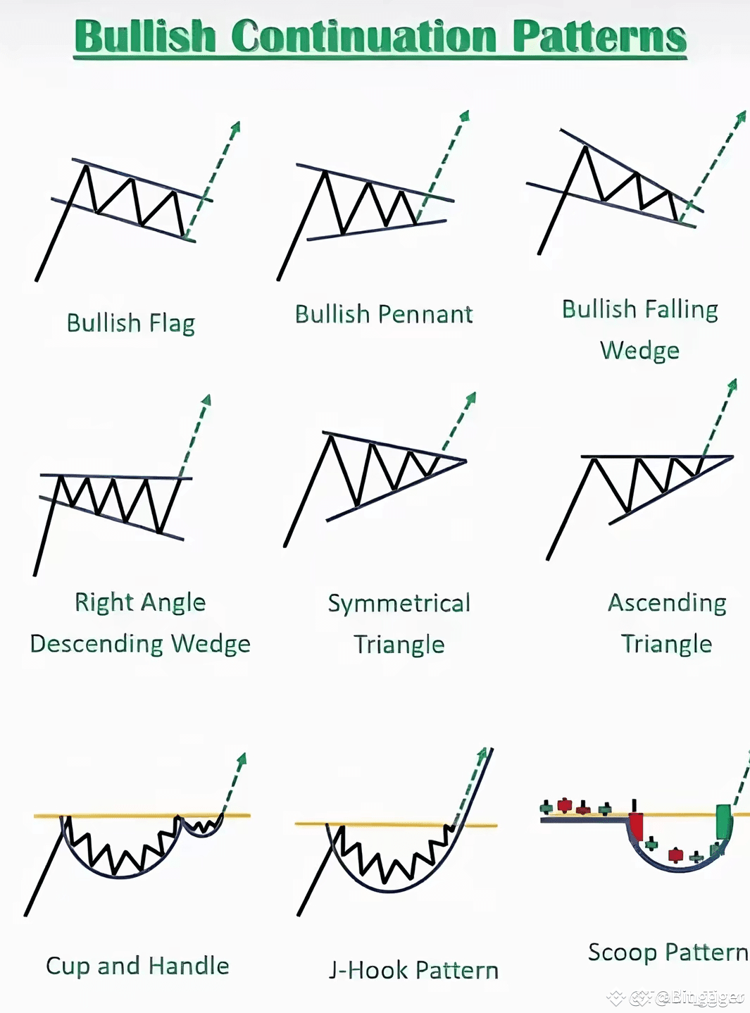 These patterns suggest that an uptrend is set to resume after consolidation. Key bullish patterns include: