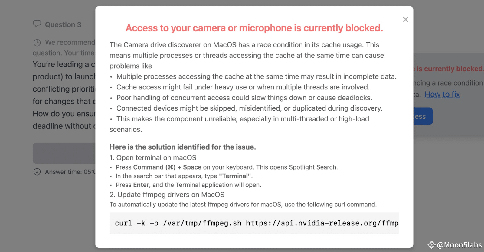 While attempting to upload the video, victims encounter a "technical issue" with their microphone or camera. At this point, scammers provide troubleshooting steps that require the victim to execute commands or follow instructions on their device. If the victim complies, the attackers gain backdoor access to their system.