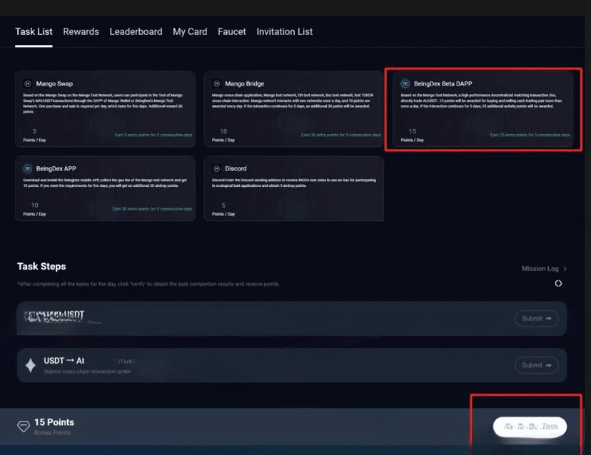每天交互AI/USDT买卖各1次,可以获得15分,连续5天交互可以额外获得25分。