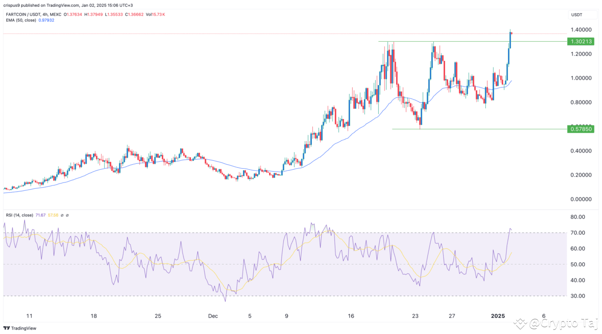 Fartcoin, a popular Solana meme coin, is another crypto token to buy. On the 4H chart, the token FARTCOIN token has rebounded, and crossed the key resistance level at $1.3021. By doing that, it has invalidated the triple-top pattern whose neckline is at $0.5785.