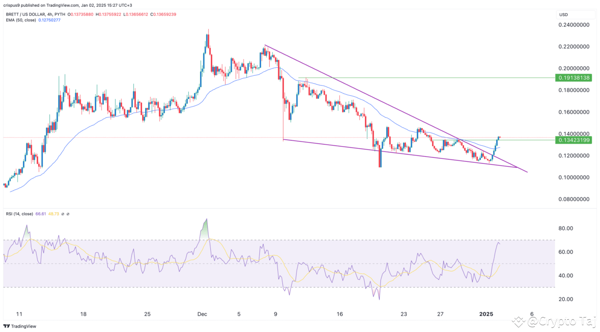 Brett is also one of the best crypto tokens to buy ahead of the Solana ETF approval. Its most bullish case is that it has formed a highly bullish chart pattern known as a falling wedge. The upper side of this wedge starts forming on December 8, while the lower side formed from December 9th.