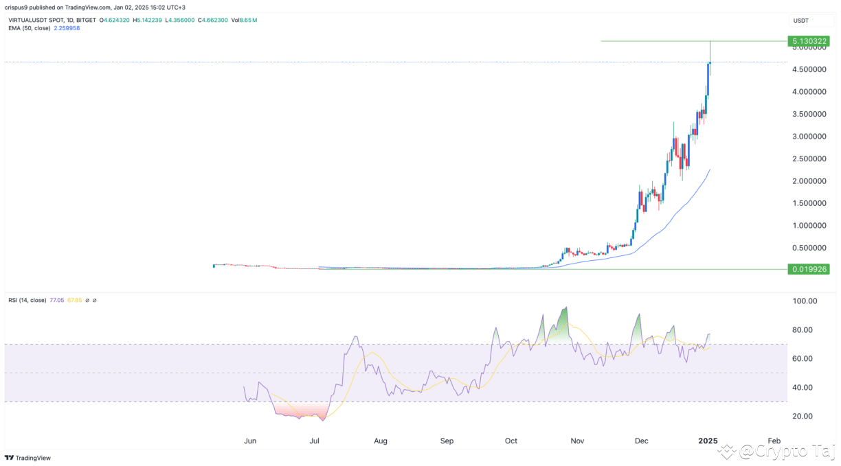 VIRTUAL is one of the top crypto tokens to 100x ahead of the Solana ETF approval. Its surge happened because of the rising demand for AI agent tokens. On the daily chart, the token soared from a low of $0.02 in 2024 and crossed the key resistance at $5 on Thursday.