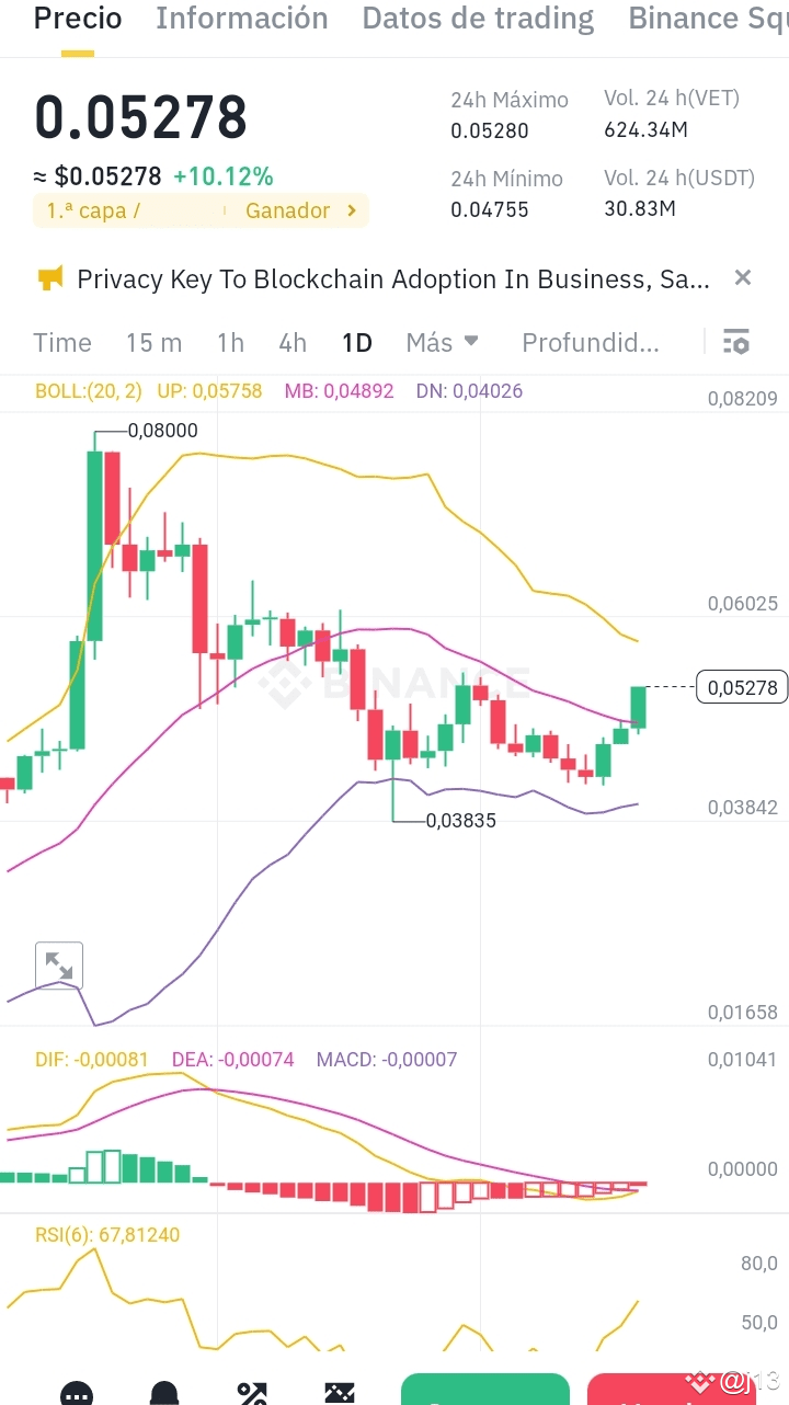 $VET está mostrando una buena recuperación, subiendo más del 10% en las últimas 24 horas. El precio actual está por encima del promedio en las Bandas de Bollinger, lo que indica que hay fuerza en el movimiento alcista. El MACD todavía está débil, pero empieza a dar señales de cambio positivo. El RSI está en 67, cerca de sobrecompra, por lo que podría haber un retroceso si sigue subiendo sin pausa. Hay un volumen considerable que respalda este movimiento, lo que es una buena señal.