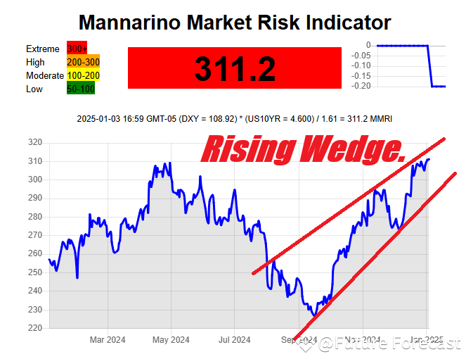 Generally, a Rising Wedge indicates the growing potential for a drop, in this case, a falling of the MMRI. A falling MMRI would indicate an upcoming rise in stock prices.