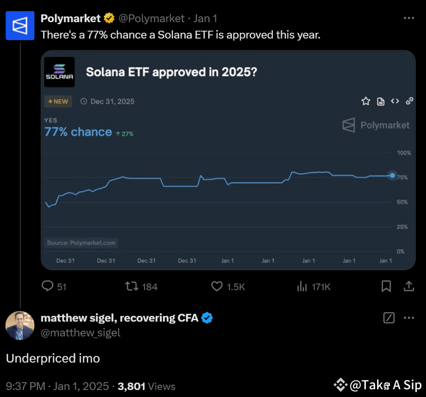 The likelihood of a U.S. SOLANA #etf approval in 2025 is increasing, with #prediction markets estimating a 77% chance. (Chart below)