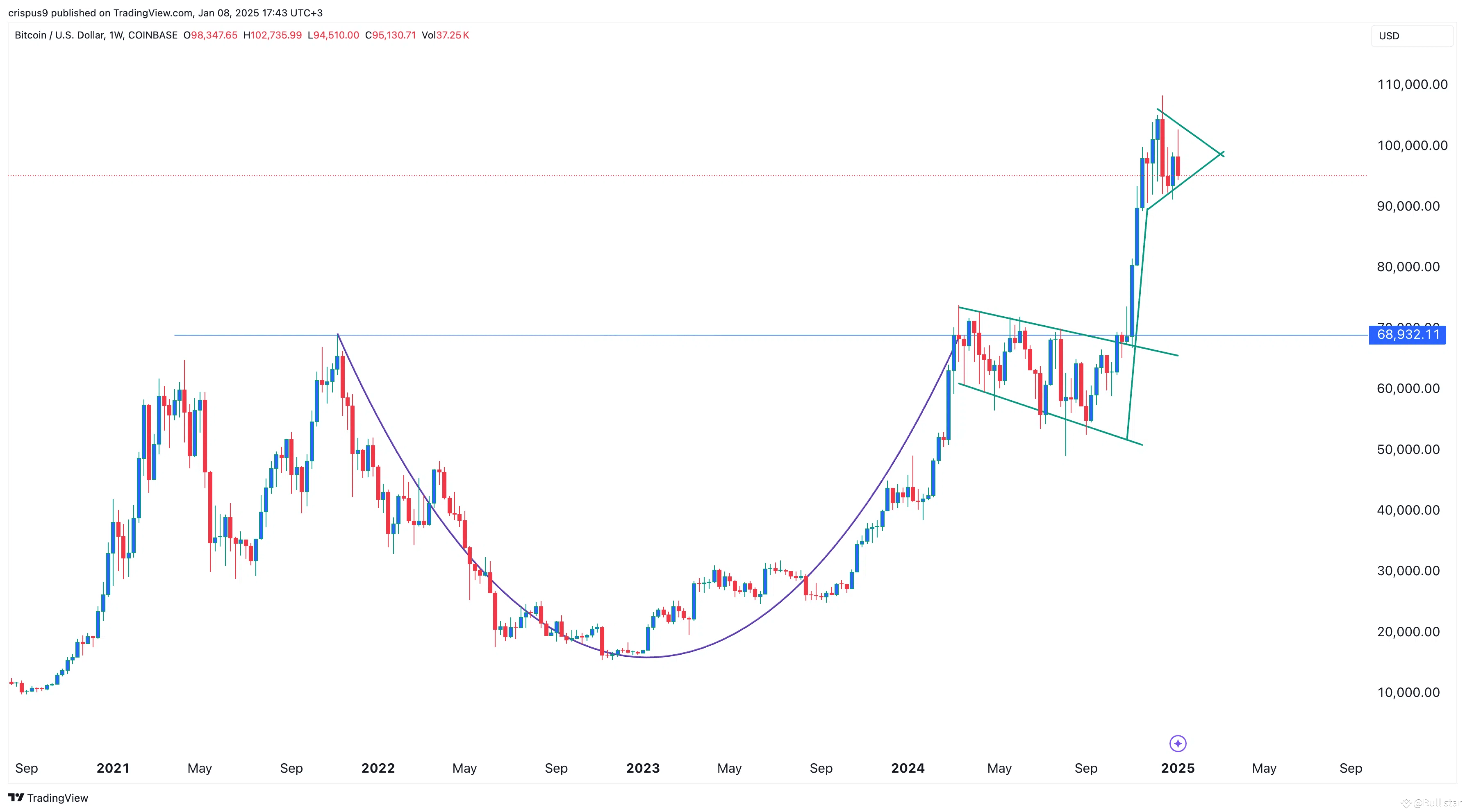 A strong breakout could occur in the coming weeks, possibly ahead of Donald Trump’s inauguration on January 20. If this breakout materializes, the key target level to watch will be $122,000. This estimate is based on measuring the depth of the cup and projecting it upward from the breakout point.