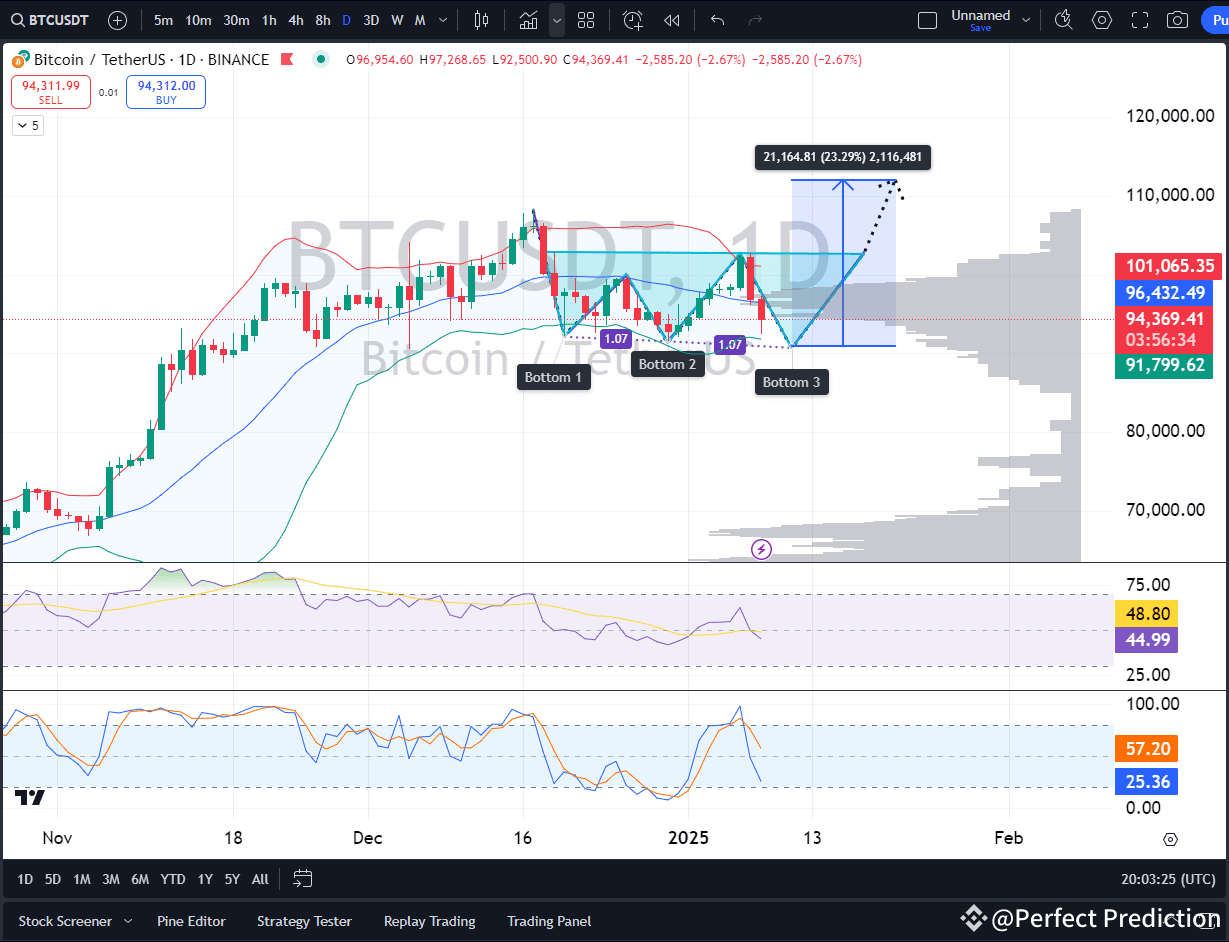 The BTC/USDT daily chart reveals a Triple Bottom setup-a classic bullish reversal pattern. Prices are bid near the lower Bollinger Band, giving the impression of oversold conditions. RSI 44 suggests recovery is about to start, and Stochastic at 25 confirms the oversold zone. Resistance at $101,000 marks the first for a breakout expected in Bitcoin toward $110,000. This structure does indicate a strong upward move, so be sure to keep a close watch!